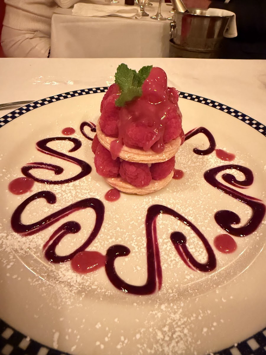 Came here on a late weekend night as this place has been on our list for a while. It was almost full around 9pm, we got seated quickly but took a while for the server to bring the menu. We did get a corner section so felt comfy and admired the French paintings all over the wall while I waited to get served. I could tell some guests were regulars, felt like a perfect restaurant to experience delicious French food at a relaxing cozy French place. The grilled calamari was excellent and they kindly divided the dish into two plates. We ordered the burger and the roasted duck which was absolutely amazing. The staff made sure the sides (mashed potato and string beans) for the duck were portioned well and it didn’t disappoint. Not just the portion but the price points and quality was great. We topped it off with the raspberry Neapolitan and it was to die for. Light and not too sweet we couldn’t stopped scooping the sauce on the plate!